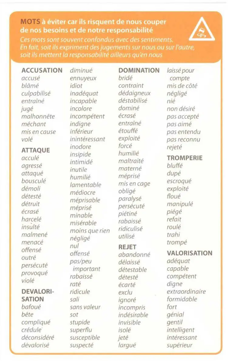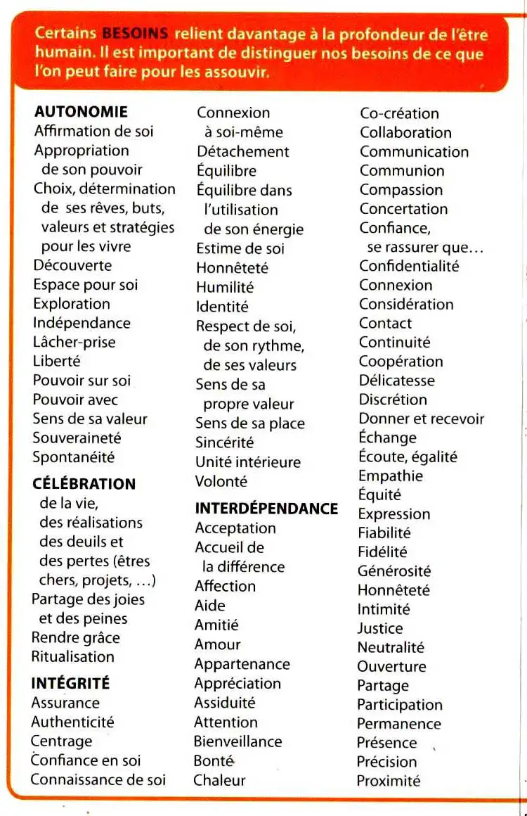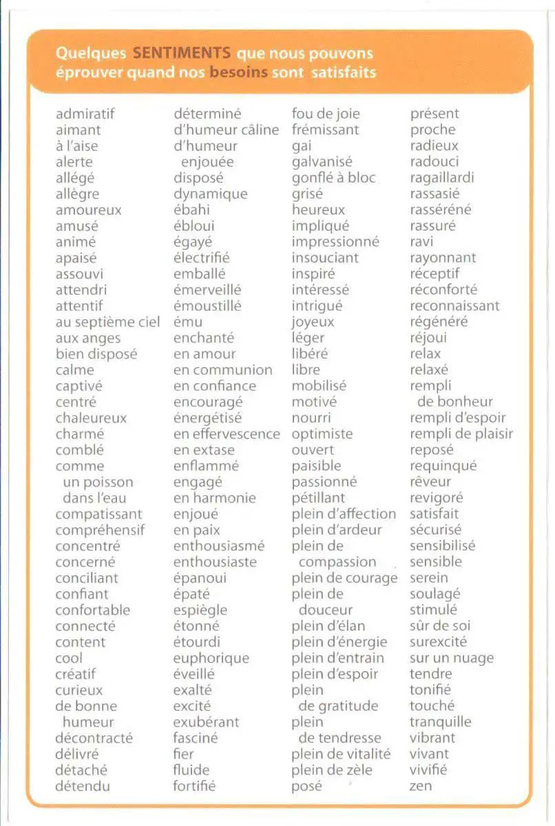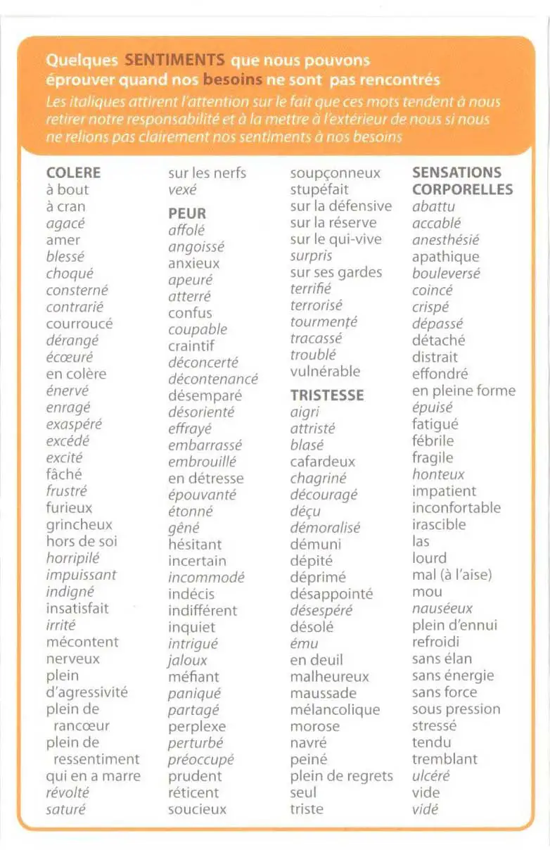 Vous pouvez utiliser ces tableaux pour trouver quels sentiments vous animent et quels besoins vous éprouvez :
