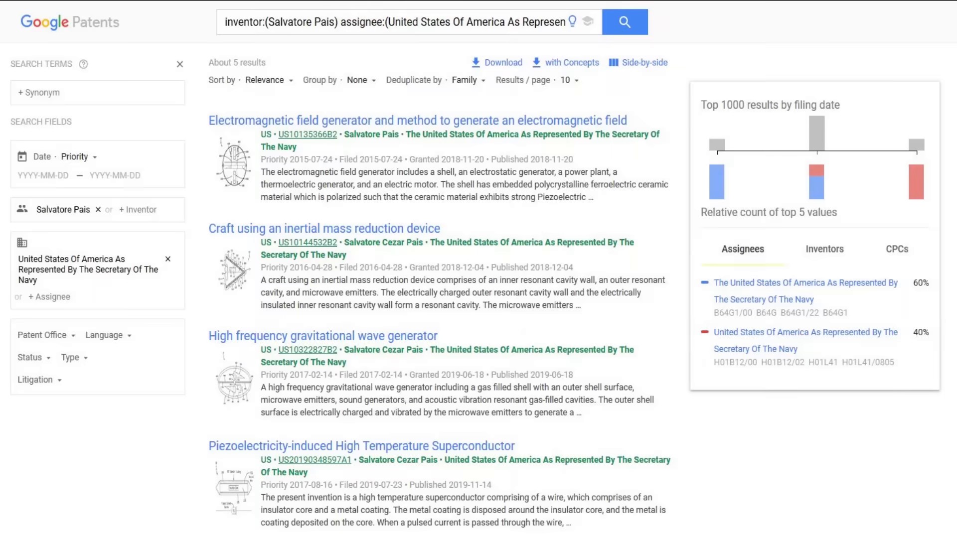 Fait troublant, le Secrétaire de la Marine des États-Unis figure comme administrateur sur plusieurs brevets de technologies aéronautiques radicales. Un homme mystérieux du nom de Salvatore Pais est notamment désigné comme l’inventeur de quatre brevets énigmatiques assignés à l’US Navy.